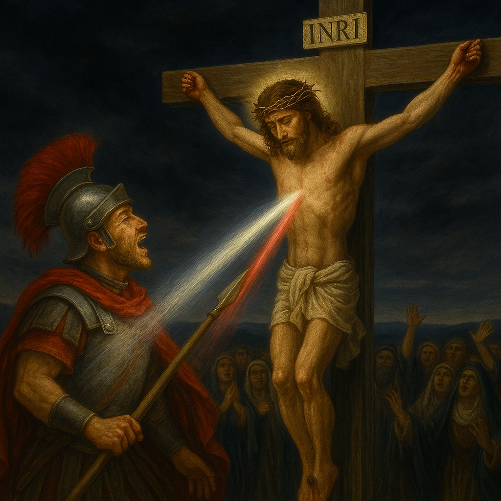 Dann kam der letzte Moment. Als Jesus seinen letzten Atemzug tat, stieß Longinus seinen Speer in die Seite des Erlösers.